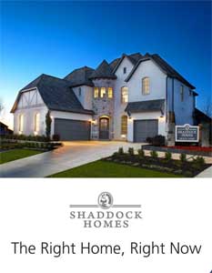 Because a home is the foundation for a family’s lifestyle, Shaddock Homes strives to make sure every new home meets its buyer’s expectations. The company builds in some of the region’s most desired locations and within its most highly regarded school districts. New homes and communities located in Allen, Celina, Dallas, Frisco, Murphy, St. Paul and Parker and are designed to reflect the way today’s families and individuals live. Each home gets personal attention to ensure the commitment and Shaddock stands behind every new home with a warranty program sponsored by Bonded Builders Warranty Group.
